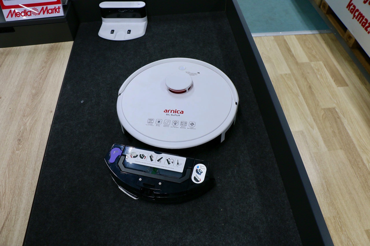Robot süpürgenin kutusundan bir adet toz haznesi, bir adet toz ve su haznesinin yanı sıra kumanda, yedek filtre, iki adet mop bezi, dört adet yan fırça ve bir adet temizleme kutusu da çıkıyor.