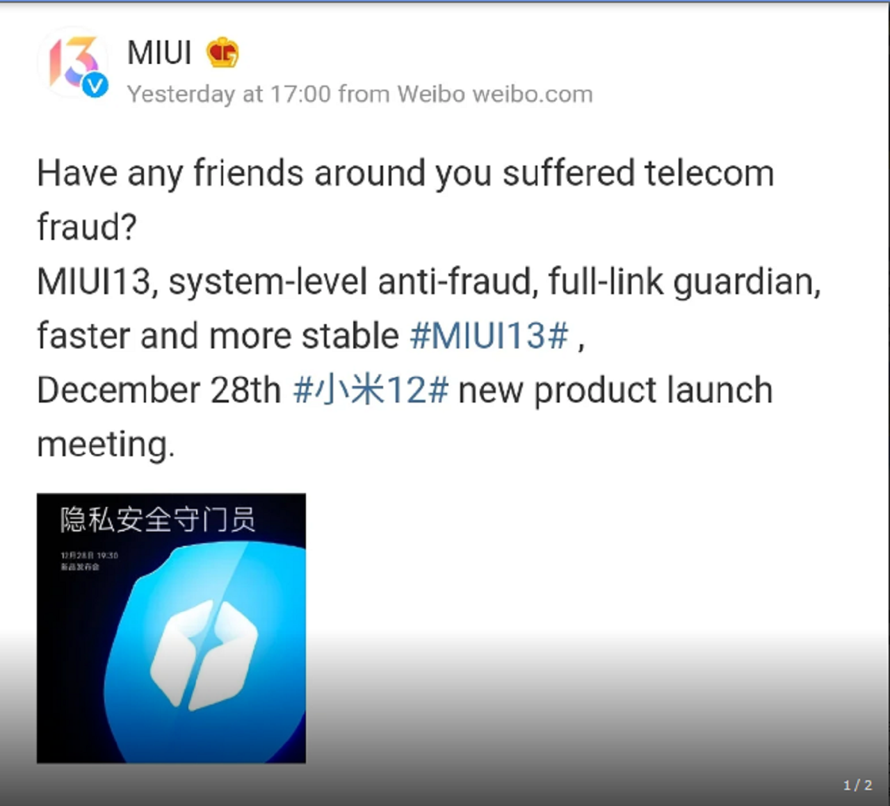 MIUI resmi Weibo hesabı, çıkışına saatler kala yeni sürümün bünyesinde barındıracağı özelliklerden bazılarını tek tek paylaşmaya başladı. Son paylaşılan işlev ise kullanıcı gizliliği ve güvenliğini artıracak dolandırıcılık önleme özelliği. (Türkçe karşılığı ise şu an için bilinmiyor)