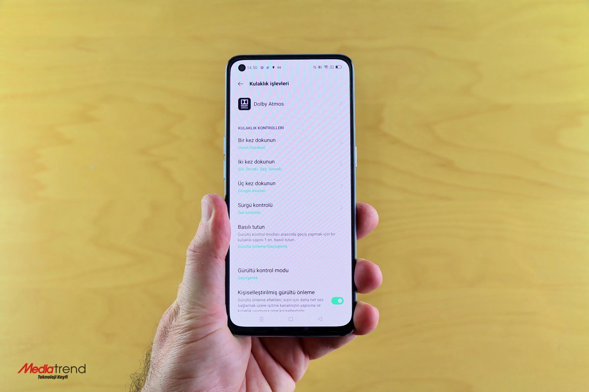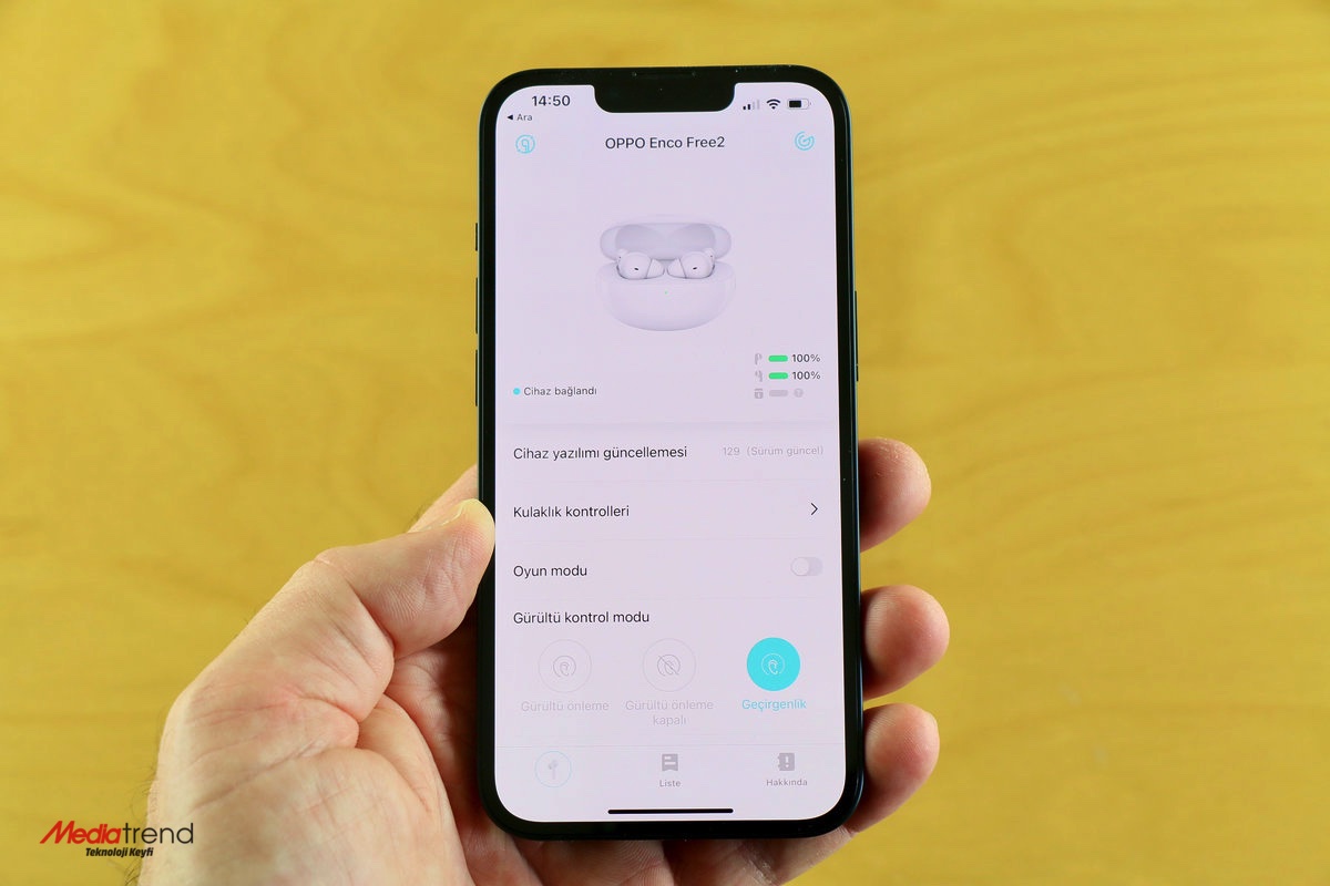 Aktif gürültü engelleme ve geçirgenlik modları arasındaki geçişi her iki kulaklığın gövde kısmının dışındaki dokunmatik alana hafifçe bastırıp bekleterek yapabilirsiniz. Buna ek olarak bir, iki veya üç kez dokunarak oynatma, duraklatma, önceki veya sonraki parçaya geçiş, Google Asistan’ı açma gibi işlevleri yerine getirebilirsiniz. Kulak içi algılama özelliği ise herhangi bir teki kulağınızdan çıkardığınızda çalan içeriğin otomatik olarak duraklatılmasını sağlıyor. Bahsettiğimiz bu özelliklerle ilgili tüm ayarları gerçekleştirmek için iki farklı yol sunuluyor. Eğer bir Oppo, Realme veya OnePlus telefonu kullanıyorsanız, telefonunuzdaki Bluetooth bölümünden Enco Free 2’nin ayarlarına girebilir ve burada tüm kontrolleri bulabilirsiniz. AAC formatını etkinleştirme, kulaklık uyum testi, kulak içi algılama, sürgü kontrolü ve Dolby Atmos ayarları burada yer alıyor. Dilerseniz otomatik yazılım güncelleştirme seçeneğini de etkinleştirebilirsiniz.