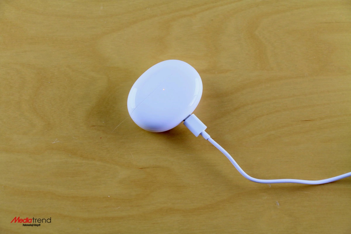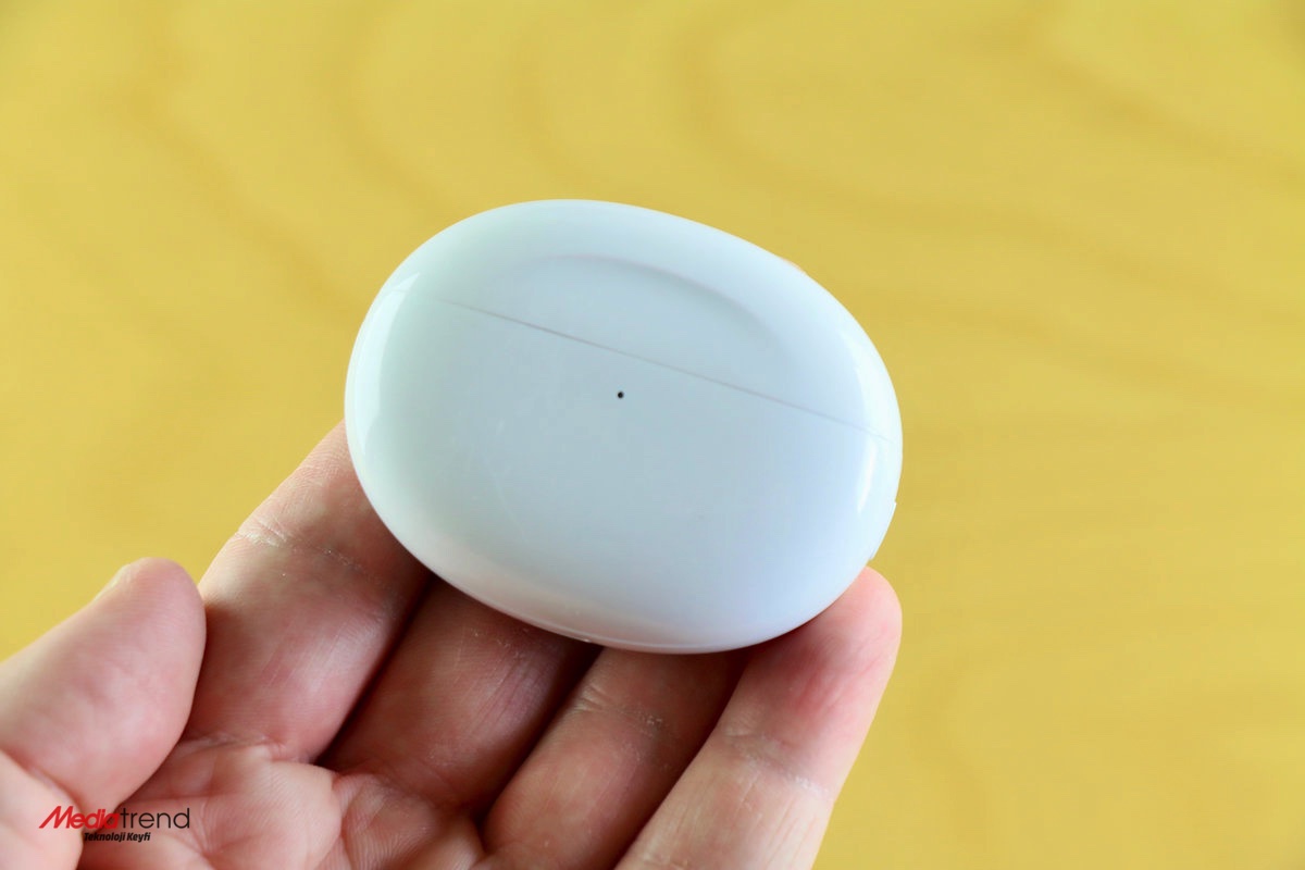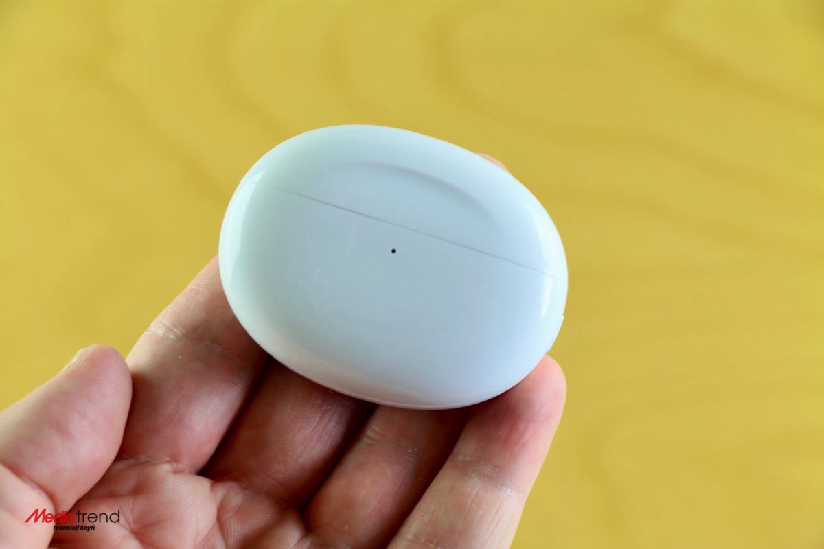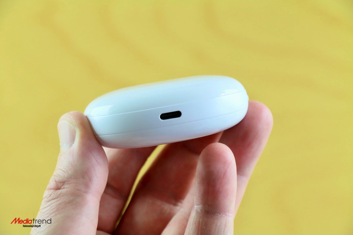Sadece kulaklık tasarımı değil, şarj kutusu tasarımı da Enco X’inkini andırıyor. Parlak plastikle kaplı yüzeyiyle oldukça şık duruyor. Kapak kısmındaki hafif girinti, tek bir parmakla kapağı kaldırmayı kolaylaştırıyor. Kapanırken hızlı ve sağlam biçimde kapandığını belirtelim. Kulaklıkları yuvalarından çıkarmak ve yerine yerleştirmek epey kolay, herhangi bir sıkıntı çekmezsiniz. Kapağın hemen altında yer alan LED lamba, hem kulaklıkların hem de kutunun şarj durumunu gösteriyor. Sağ kenarda eşleştirme düğmesi var. Alt kenarda yer alan USB-C portu ile şarj işlemi gerçekleştiriliyor.