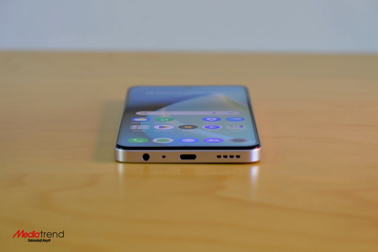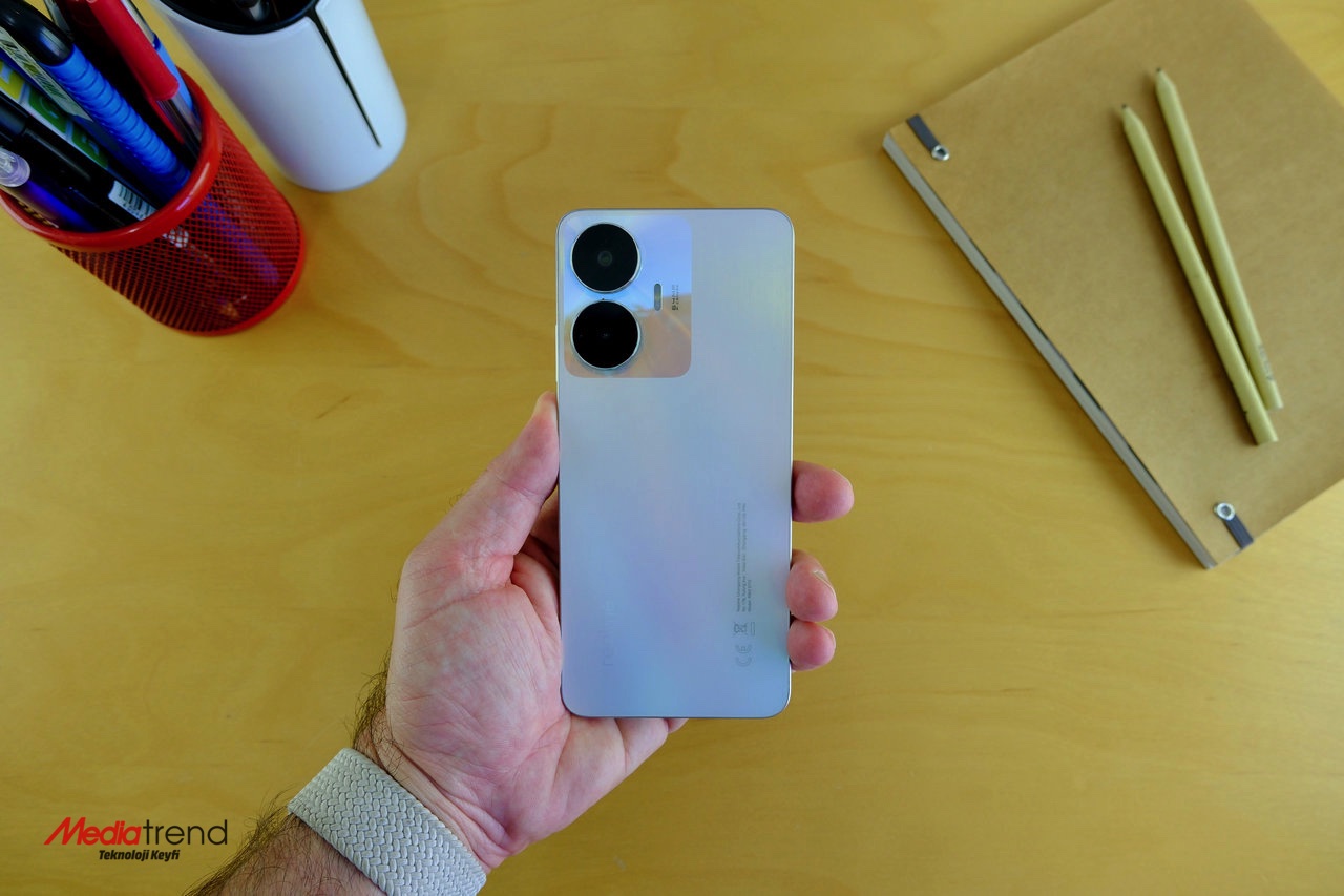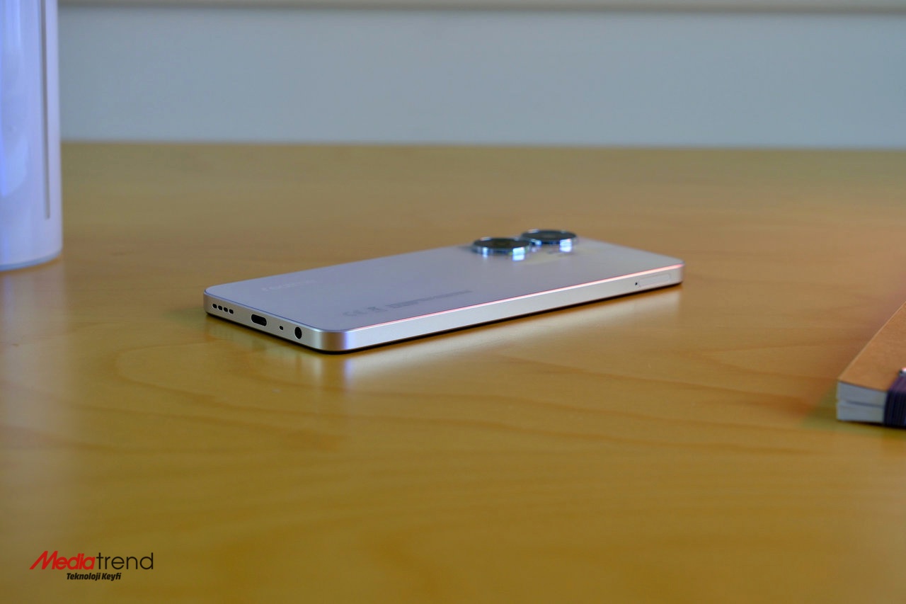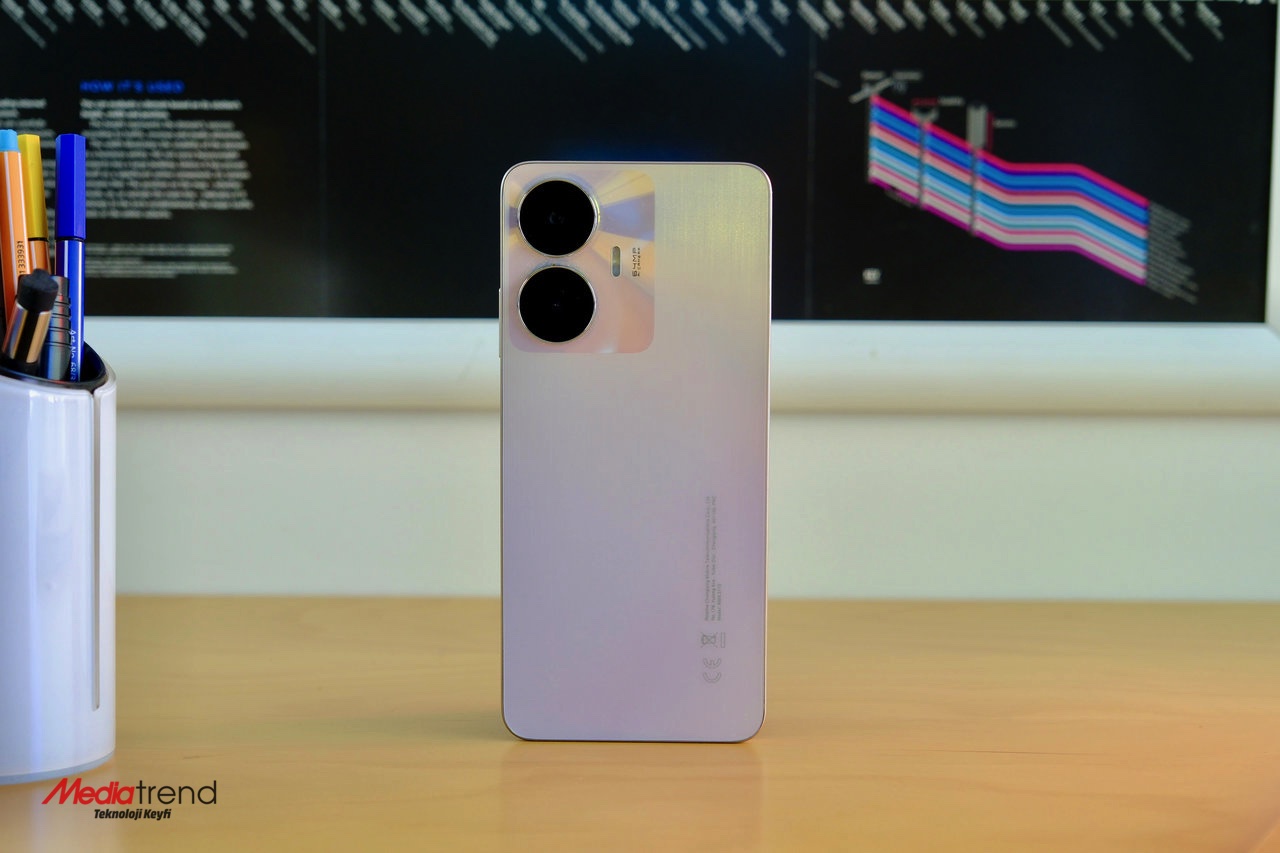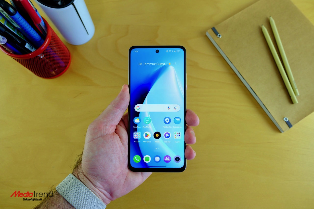 Realme C55, temel olarak plastikten yapılmış bir telefon olmasına rağmen, sağlam ve kaliteli bir telefon olduğu hissiyatını veriyor. Ele de iyi oturuyor. Günümüz giriş ve orta segment akıllı telefon trendlerine uygun şekilde düz ön ve arka panel ve onunla uyumlu düz bir çerçeveyle geliyor. 7.9 mm kalınlığında ve 189,5 gram ağırlığında olan telefon, uzun süreli kullanım için de uygun. Arka tarafın deseni ve kamera modülü de telefonu çok şık ve sınıfının üstünde değerli gösteren önemli unsurlar arasında bulunuyor. Telefonun kutusundan çıkan şeffaf taşıma kılıfıyla estetiğini gölgelemeden, onu daha güvenli şekilde kullanabilirsiniz. Ekran, telefonun ön panelinin yüzde 86.7’sini kaplıyor. Ekranın orta üst kısmında ön kamera yuvası, üst kısmında ise görünmez bir ahize hoparlörü ve sensörler bulunuyor. Ekran çerçevesi alt kenarda biraz daha kalınlaşıyor. Sol kenarında çift nano SIM kart ve microSD kart yuvası, sağ kenarında ise güç butonu ve ses kontrol tuşları bulunuyor. Alt kenarda ise USB-C portu var. Güç butonu aynı zamanda parmak izi tarayıcısı işlevi görüyor ve ekran kilidini hızlı şekilde geçmeyi sağlıyor. Bu arada ön kamera yardımıyla yüz tanıma özelliğini de kullanabilirsiniz.