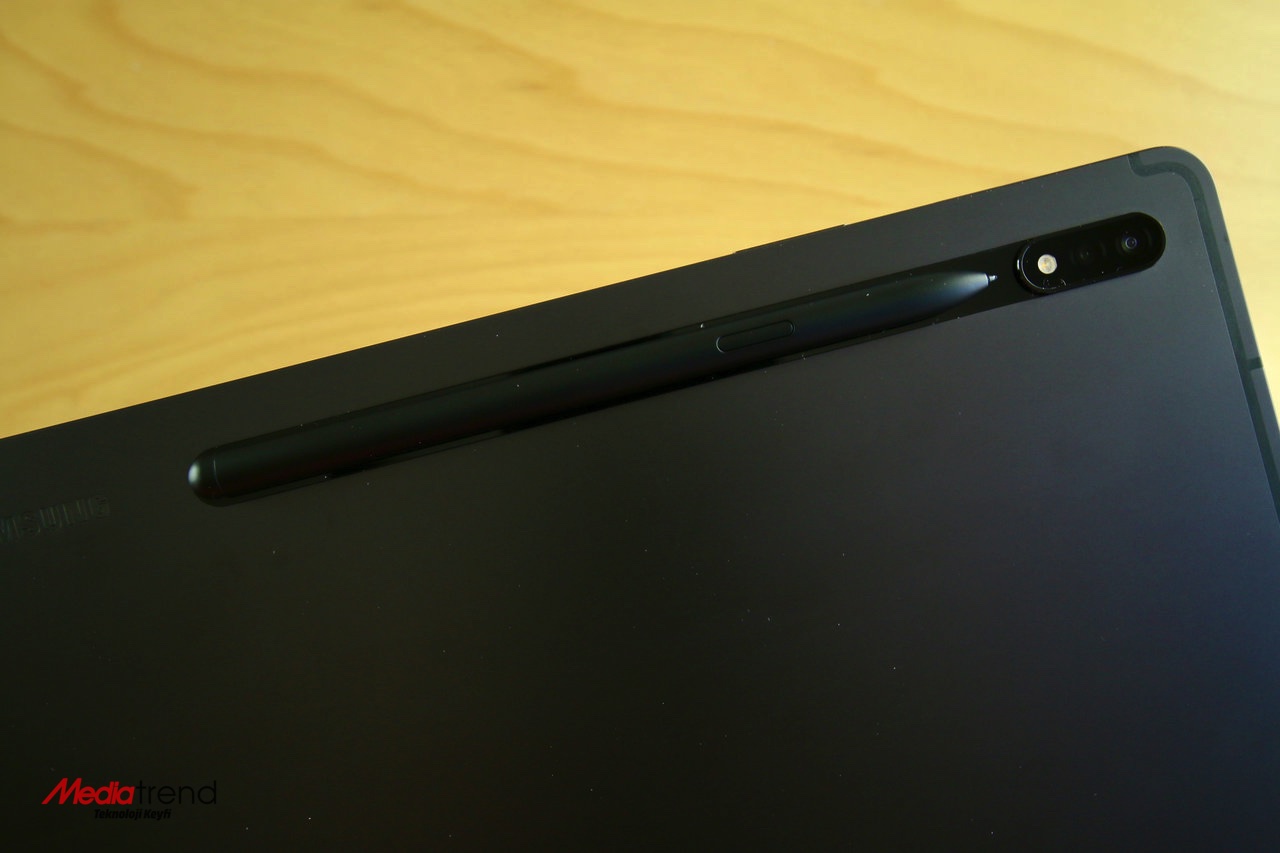 Samsung’un S Pen’i kutuya eklediğini söylemiştik. Arkada, kameranın uzantısı olan cam bölüm, S Pen’in eşleştirme, şarj ve taşıma alanı. S Pen’i kullanacağınız zaman ekranın bir kenarında Temassız Komut simgesini göreceksiniz. Buna tıklattığınızda kalemle kullanabileceğiniz çeşitli araçlar karşınıza çıkacak. Hemen hızlı biçimde not alma, ekran görüntüsü alıp üstünde çizimler yapma, not alma gibi işlerde bu kalem gerçekten kullanışlı oluyor. Kalemin hızı iyi, normal bir defter-kalem ikilisinin sunduğu rahatlığı sağlayabiliyor.